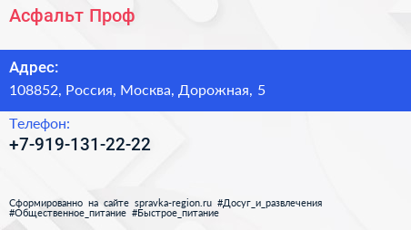 Асфальт Проф по адресу 108852, Россия, Москва, Дорожная, 5 в дальнейшем Организация, размещена в следующих категориях: