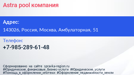 Astra pool, компания по адресу 143026, Россия, Москва, Амбулаторная, 51 в дальнейшем Организация, размещена в следующих категориях: