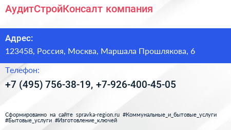 АудитСтройКонсалт, компания по адресу 123458, Россия, Москва, Маршала Прошлякова, 6 в дальнейшем Организация, размещена в следующих категориях: