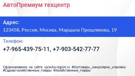 АвтоПремиум, техцентр по адресу 123458, Россия, Москва, Маршала Прошлякова, 19 в дальнейшем Организация, размещена в следующих категориях:
