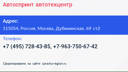 Автоспринт, автотехцентр по адресу 115054, Россия, Москва, Дубининская, 69 ст2 в дальнейшем Организация, размещена в следующих категориях: