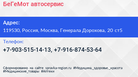 БеГеМот, автосервис по адресу 119530, Россия, Москва, Генерала Дорохова, 20 ст5 в дальнейшем Организация, размещена в следующих категориях: