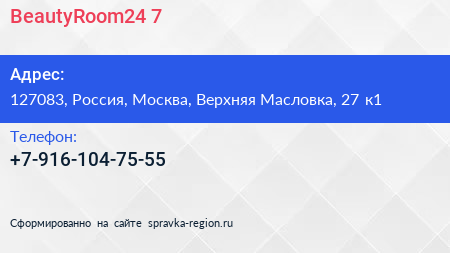BeautyRoom24-7 по адресу 127083, Россия, Москва, Верхняя Масловка, 27 к1 в дальнейшем Организация, размещена в следующих категориях: