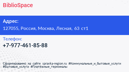 BiblioSpace по адресу 127055, Россия, Москва, Лесная, 63 ст1 в дальнейшем Организация, размещена в следующих категориях: