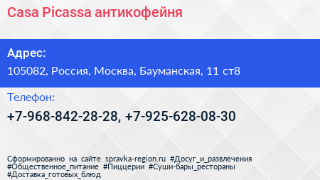 Casa Picassa, антикофейня по адресу 105082, Россия, Москва, Бауманская, 11 ст8 в дальнейшем Организация, размещена в следующих категориях: