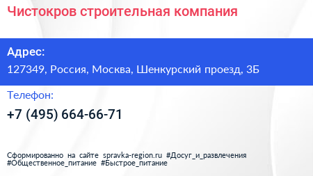 Чистокров, строительная компания по адресу 127349, Россия, Москва, Шенкурский проезд, 3Б в дальнейшем Организация, размещена в следующих категориях: