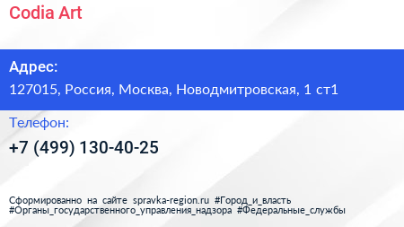 Codia.Art по адресу 127015, Россия, Москва, Новодмитровская, 1 ст1 в дальнейшем Организация, размещена в следующих категориях: