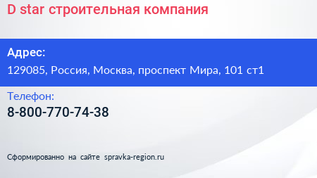 D-star, строительная компания по адресу 129085, Россия, Москва, проспект Мира, 101 ст1 в дальнейшем Организация, размещена в следующих категориях: