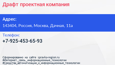Драфт, проектная компания по адресу 143404, Россия, Москва, Дачная, 11а в дальнейшем Организация, размещена в следующих категориях: