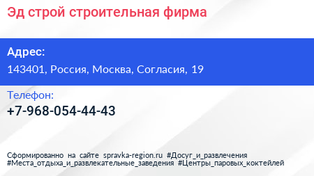 Эд строй, строительная фирма по адресу 143401, Россия, Москва, Согласия, 19 в дальнейшем Организация, размещена в следующих категориях: