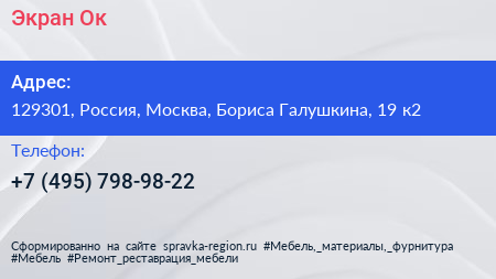 Экран-Ок по адресу 129301, Россия, Москва, Бориса Галушкина, 19 к2 в дальнейшем Организация, размещена в следующих категориях: