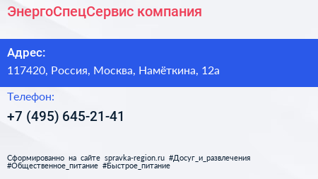 ЭнергоСпецСервис, компания по адресу 117420, Россия, Москва, Намёткина, 12а в дальнейшем Организация, размещена в следующих категориях: