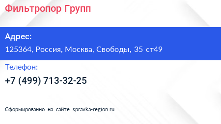 Фильтропор Групп по адресу 125364, Россия, Москва, Свободы, 35 ст49 в дальнейшем Организация, размещена в следующих категориях: