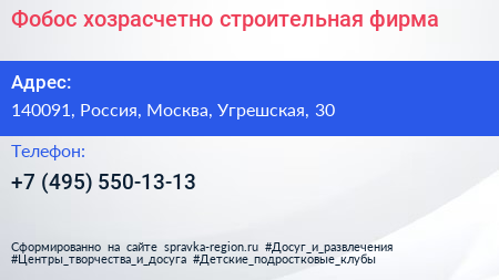 Фобос, хозрасчетно-строительная фирма по адресу 140091, Россия, Москва, Угрешская, 30 в дальнейшем Организация, размещена в следующих категориях: