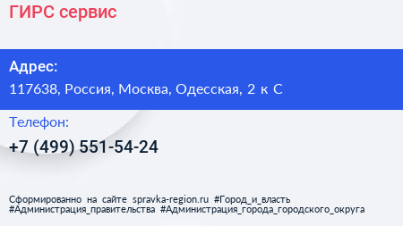 ГИРС-сервис по адресу 117638, Россия, Москва, Одесская, 2 к C в дальнейшем Организация, размещена в следующих категориях: