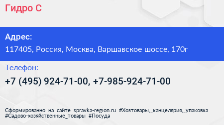Гидро С по адресу 117405, Россия, Москва, Варшавское шоссе, 170г в дальнейшем Организация, размещена в следующих категориях: