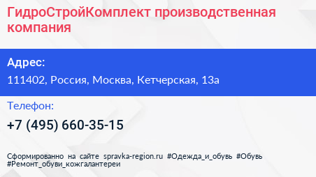 ГидроСтройКомплект, производственная компания по адресу 111402, Россия, Москва, Кетчерская, 13а в дальнейшем Организация, размещена в следующих категориях: