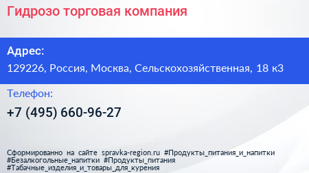 Гидрозо, торговая компания по адресу 129226, Россия, Москва, Сельскохозяйственная, 18 к3 в дальнейшем Организация, размещена в следующих категориях: