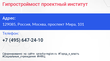 Гипростроймост, проектный институт по адресу 129085, Россия, Москва, проспект Мира, 101 в дальнейшем Организация, размещена в следующих категориях: