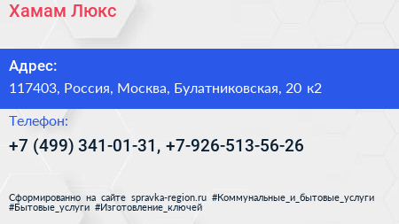 Хамам Люкс по адресу 117403, Россия, Москва, Булатниковская, 20 к2 в дальнейшем Организация, размещена в следующих категориях: