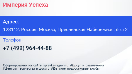 Империя Успеха по адресу 123112, Россия, Москва, Пресненская Набережная, 6 ст2 в дальнейшем Организация, размещена в следующих категориях: