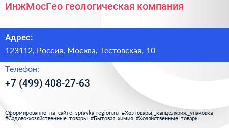 ИнжМосГео, геологическая компания по адресу 123112, Россия, Москва, Тестовская, 10 в дальнейшем Организация, размещена в следующих категориях: