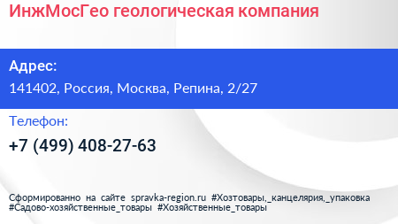 ИнжМосГео, геологическая компания по адресу 141402, Россия, Москва, Репина, 2/27 в дальнейшем Организация, размещена в следующих категориях: