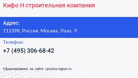 Кифо-Н, строительная компания по адресу 111398, Россия, Москва, Лазо, 9 в дальнейшем Организация, размещена в следующих категориях: