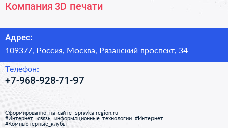 Компания 3D-печати по адресу 109377, Россия, Москва, Рязанский проспект, 34 в дальнейшем Организация, размещена в следующих категориях:
