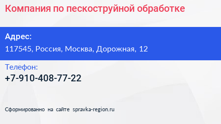 Компания по пескоструйной обработке по адресу 117545, Россия, Москва, Дорожная, 12 в дальнейшем Организация, размещена в следующих категориях: