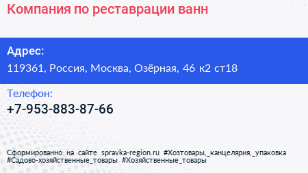 Компания по реставрации ванн по адресу 119361, Россия, Москва, Озёрная, 46 к2 ст18 в дальнейшем Организация, размещена в следующих категориях: