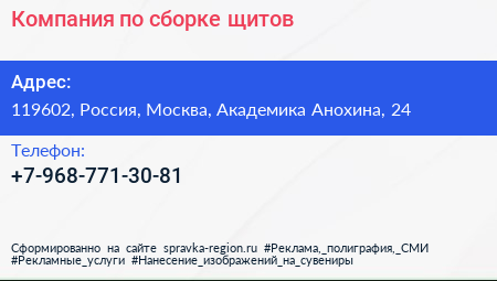 Компания по сборке щитов по адресу 119602, Россия, Москва, Академика Анохина, 24 в дальнейшем Организация, размещена в следующих категориях: