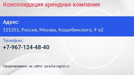 Консолидация, арендная компания по адресу 121351, Россия, Москва, Коцюбинского, 9 к2 в дальнейшем Организация, размещена в следующих категориях: