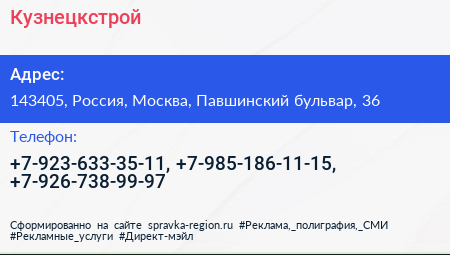 Кузнецкстрой по адресу 143405, Россия, Москва, Павшинский бульвар, 36 в дальнейшем Организация, размещена в следующих категориях: