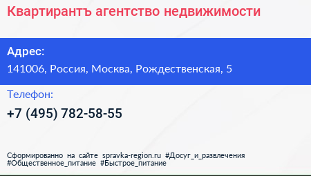 Квартирантъ, агентство недвижимости по адресу 141006, Россия, Москва, Рождественская, 5 в дальнейшем Организация, размещена в следующих категориях:
