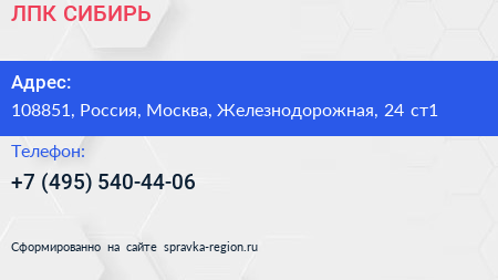 ЛПК СИБИРЬ по адресу 108851, Россия, Москва, Железнодорожная, 24 ст1 в дальнейшем Организация, размещена в следующих категориях: