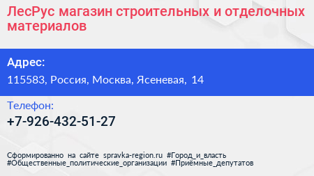 ЛесРус, магазин строительных и отделочных материалов по адресу 115583, Россия, Москва, Ясеневая, 14 в дальнейшем Организация, размещена в следующих категориях: