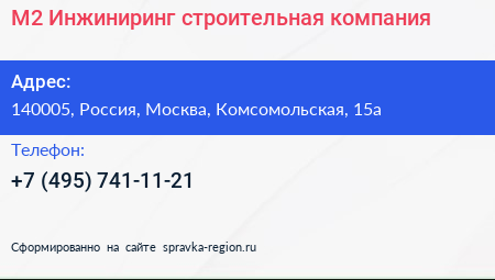 М2 Инжиниринг, строительная компания по адресу 140005, Россия, Москва, Комсомольская, 15а в дальнейшем Организация, размещена в следующих категориях: