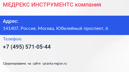 МЕДРЕКС ИНСТРУМЕНТС, компания по адресу 141407, Россия, Москва, Юбилейный проспект, 6 в дальнейшем Организация, размещена в следующих категориях: