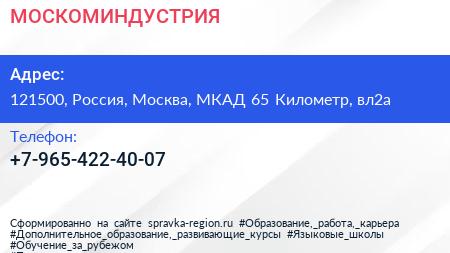 МОСКОМИНДУСТРИЯ по адресу 121500, Россия, Москва, МКАД 65 Километр, вл2а в дальнейшем Организация, размещена в следующих категориях: