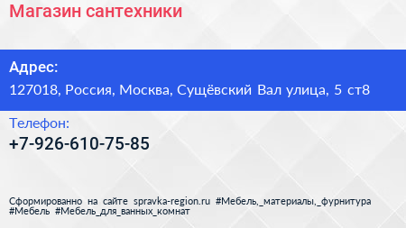 Магазин сантехники по адресу 127018, Россия, Москва, Сущёвский Вал улица, 5 ст8 в дальнейшем Организация, размещена в следующих категориях: