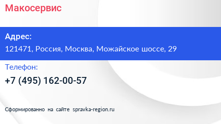 Макосервис по адресу 121471, Россия, Москва, Можайское шоссе, 29 в дальнейшем Организация, размещена в следующих категориях:
