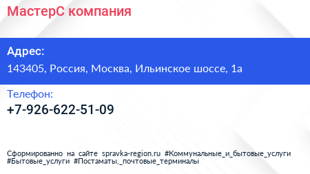 МастерС, компания по адресу 143405, Россия, Москва, Ильинское шоссе, 1а в дальнейшем Организация, размещена в следующих категориях: