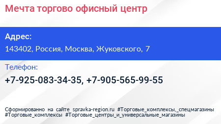 Мечта, торгово-офисный центр по адресу 143402, Россия, Москва, Жуковского, 7 в дальнейшем Организация, размещена в следующих категориях: