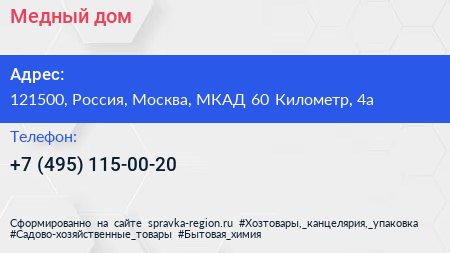 Медный дом по адресу 121500, Россия, Москва, МКАД 60 Километр, 4а в дальнейшем Организация, размещена в следующих категориях:
