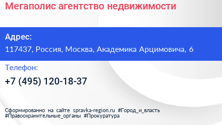 Мегаполис, агентство недвижимости по адресу 117437, Россия, Москва, Академика Арцимовича, 6 в дальнейшем Организация, размещена в следующих категориях: