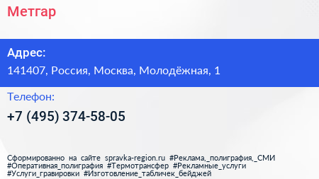 Метгар по адресу 141407, Россия, Москва, Молодёжная, 1 в дальнейшем Организация, размещена в следующих категориях: