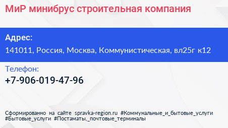 МиР-минибрус, строительная компания по адресу 141011, Россия, Москва, Коммунистическая, вл25г к12 в дальнейшем Организация, размещена в следующих категориях: