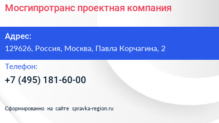 Мосгипротранс, проектная компания по адресу 129626, Россия, Москва, Павла Корчагина, 2 в дальнейшем Организация, размещена в следующих категориях: