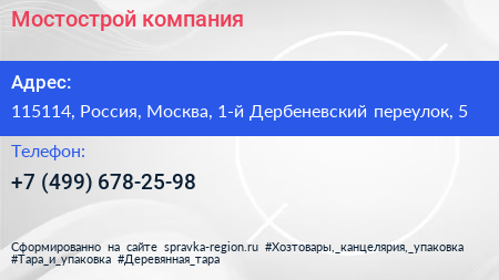 Мостострой, компания по адресу 115114, Россия, Москва, 1-й Дербеневский переулок, 5 в дальнейшем Организация, размещена в следующих категориях: